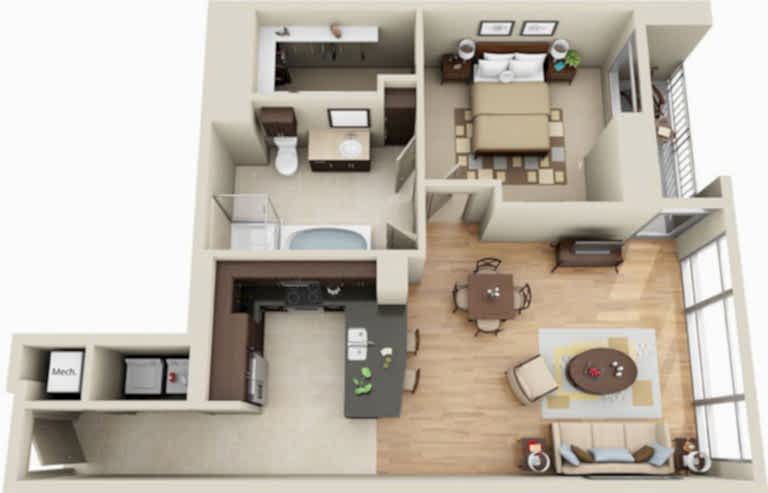 - На полу ламинат, замковая или клеевая ПВХ плитка, керамогранит, плинтус ПВХ/МДФ/под покраску, PinUp полы