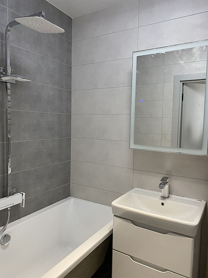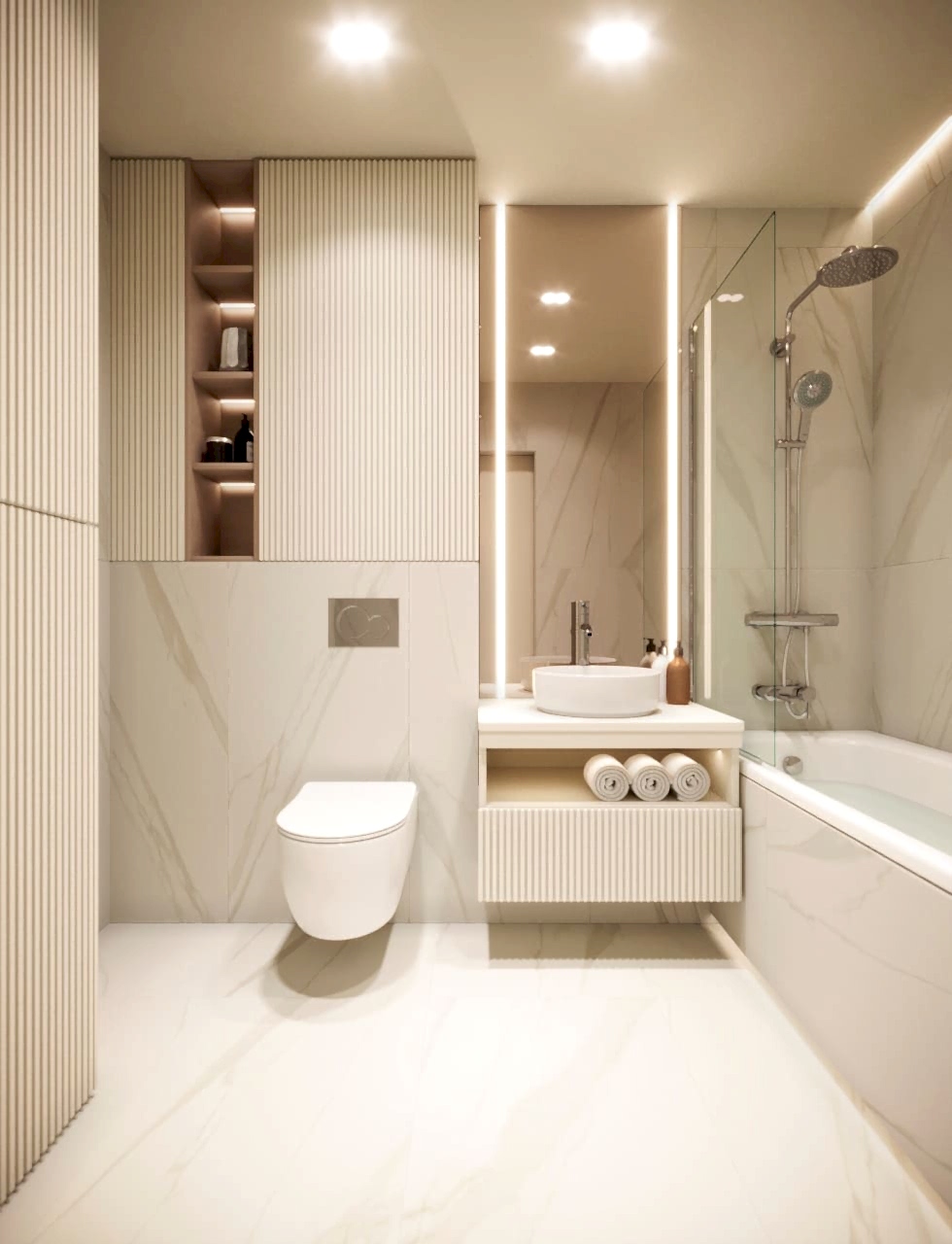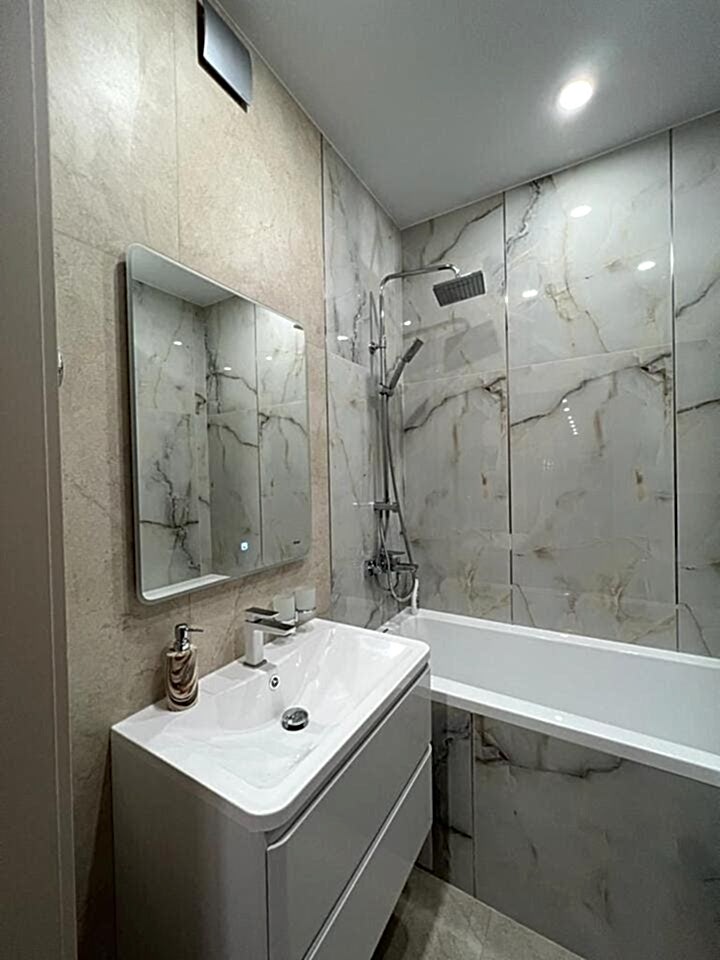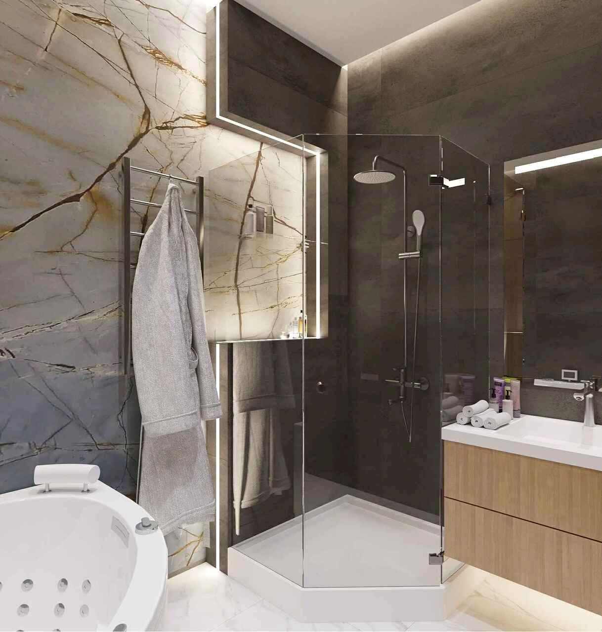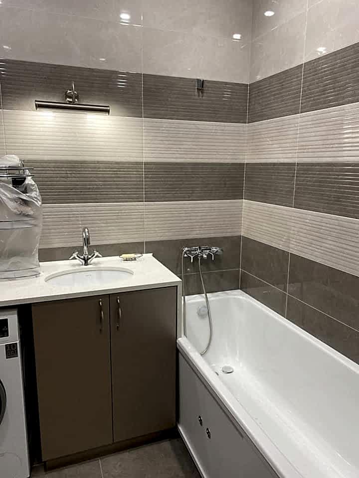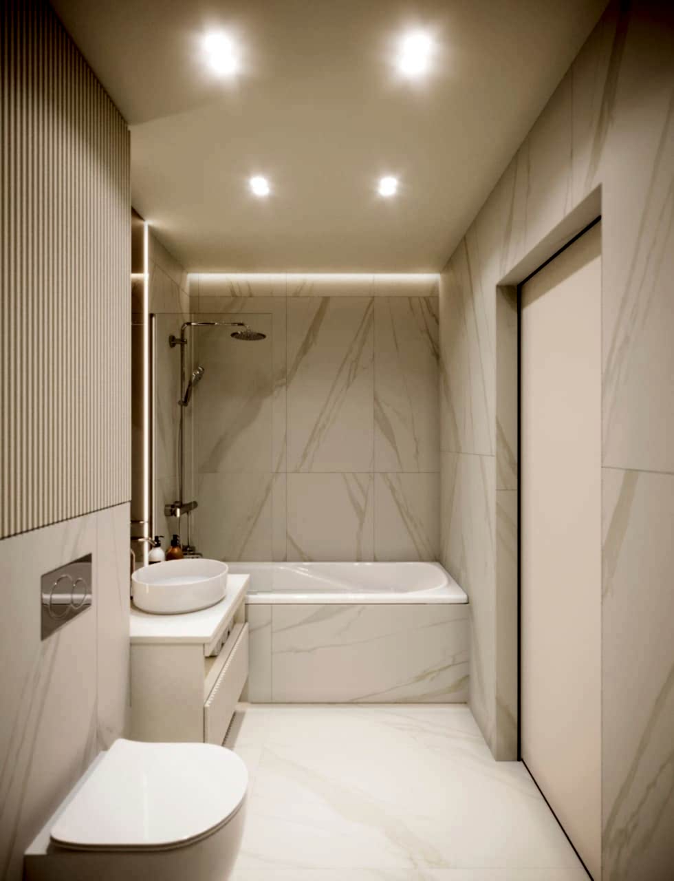 - В санузлах: разводка сантехники, на стенах и PinUp - кафель или керамогранит (размер до 60х60), унитазы подвесные с инсталляцией, акриловая ванна с экраном под кафель, ниши и полки из кафеля