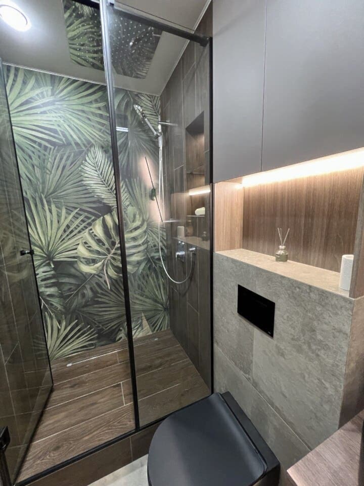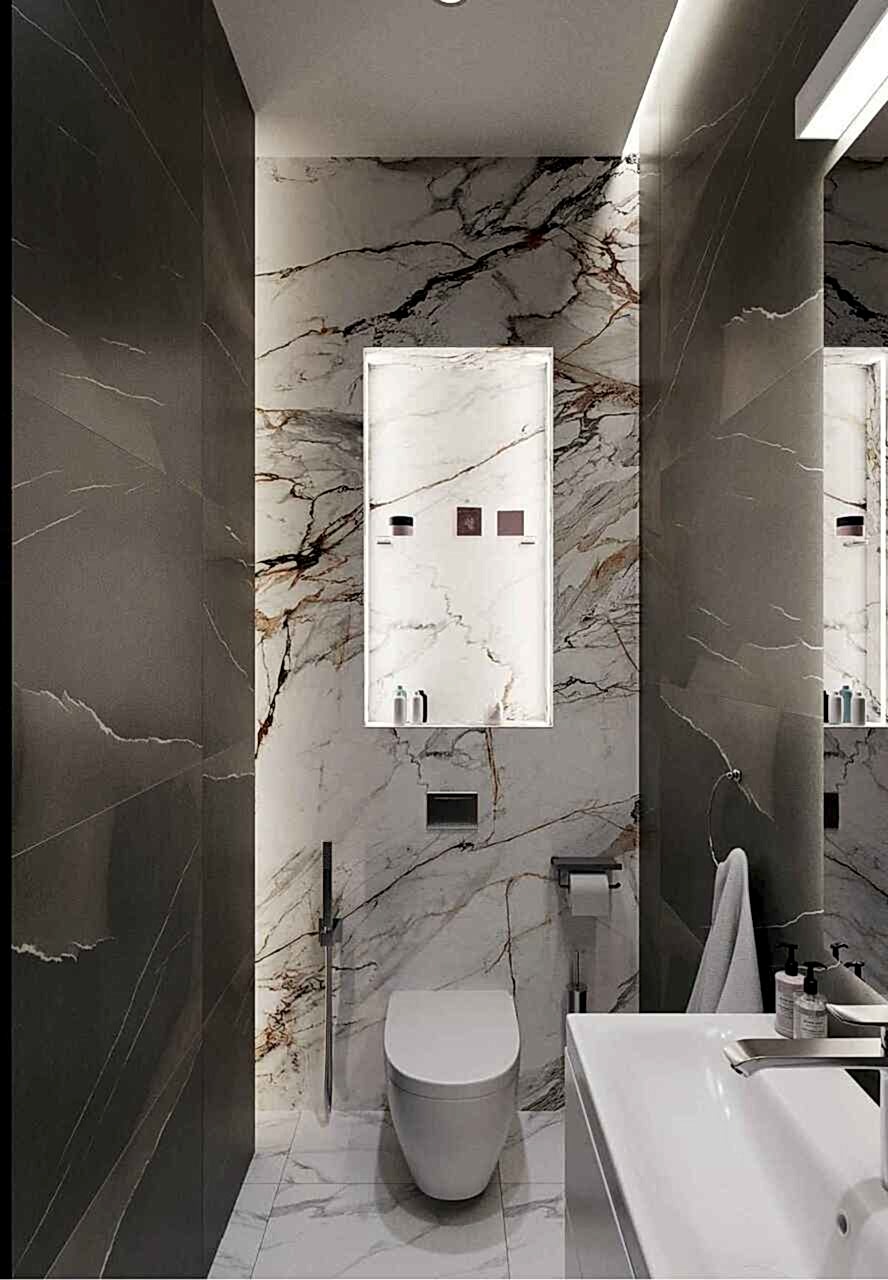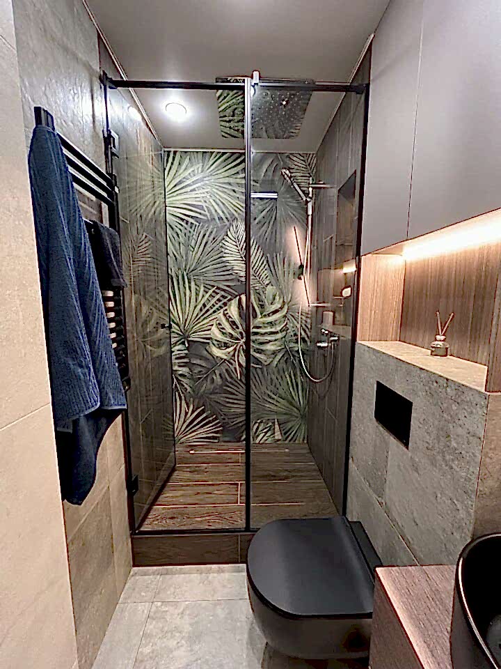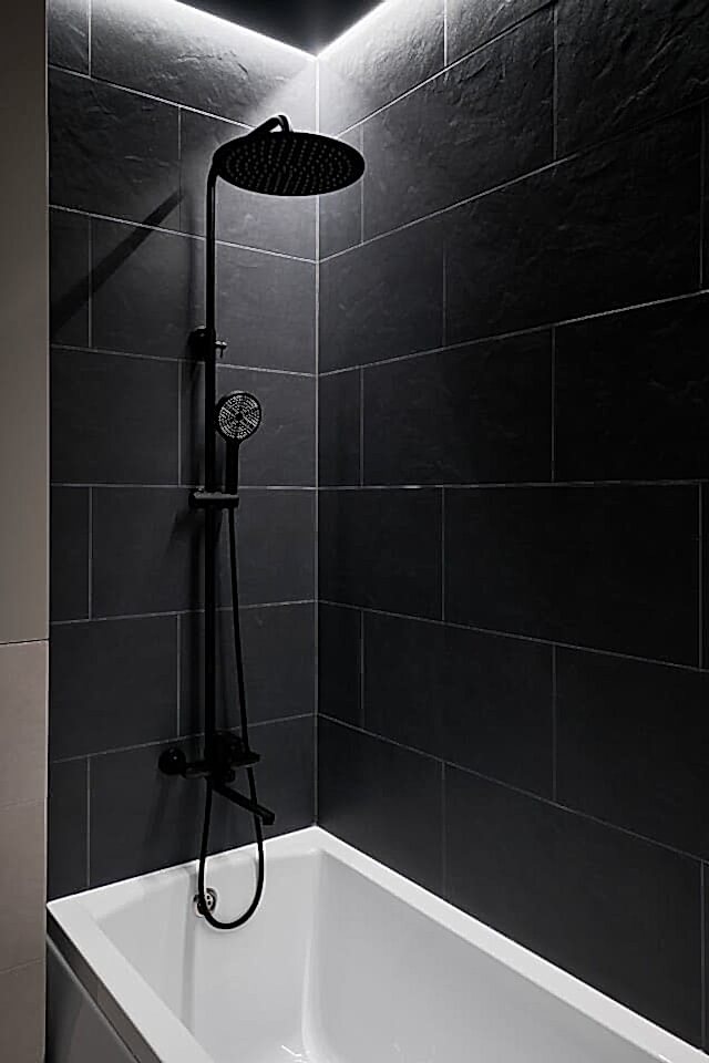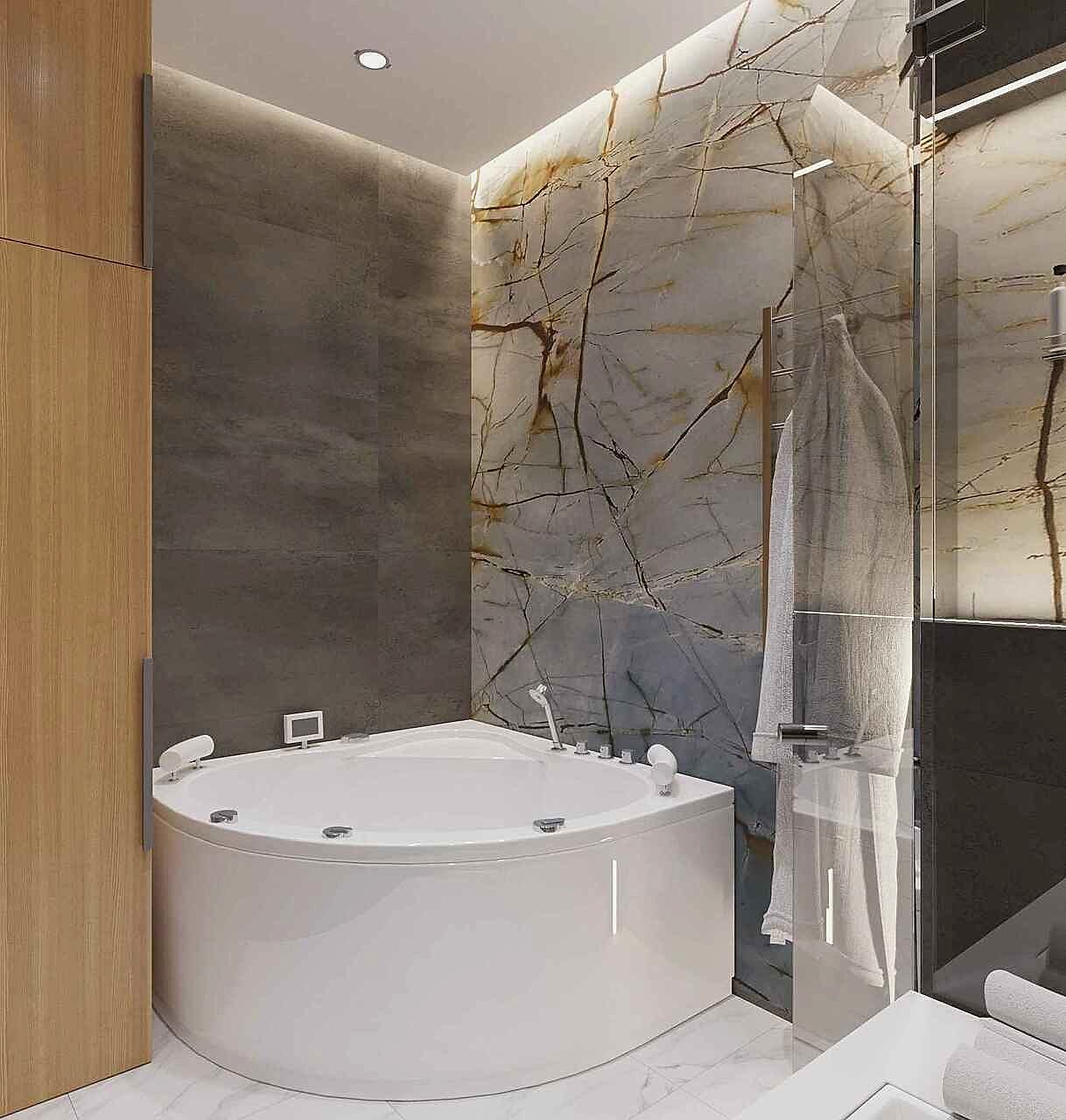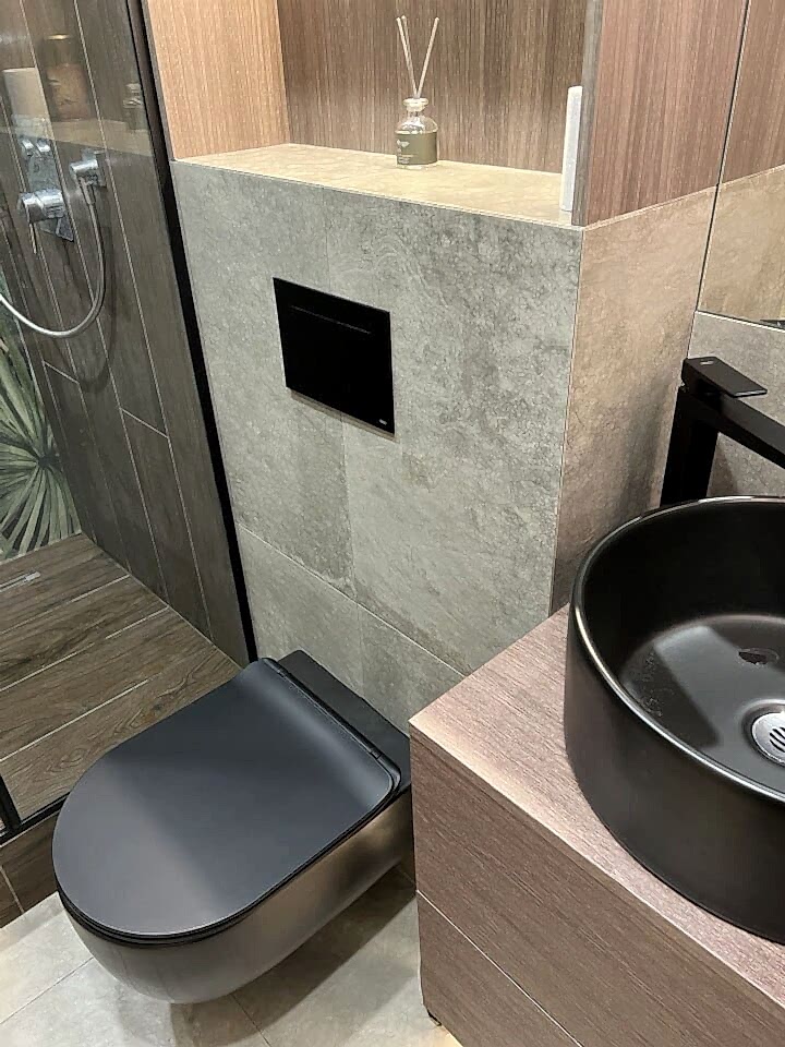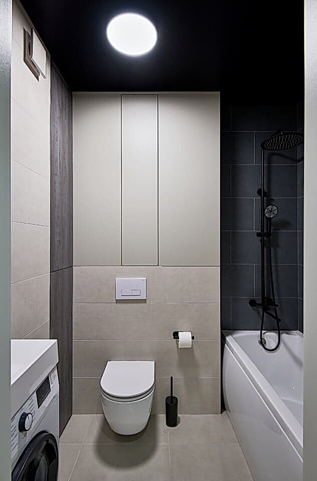 - В санузлах: разводка сантехники, на стенах и PinUp - кафель или керамогранит (размер до 60х60), унитазы подвесные с инсталляцией, акриловая ванна с экраном под кафель, ниши и полки из кафеля