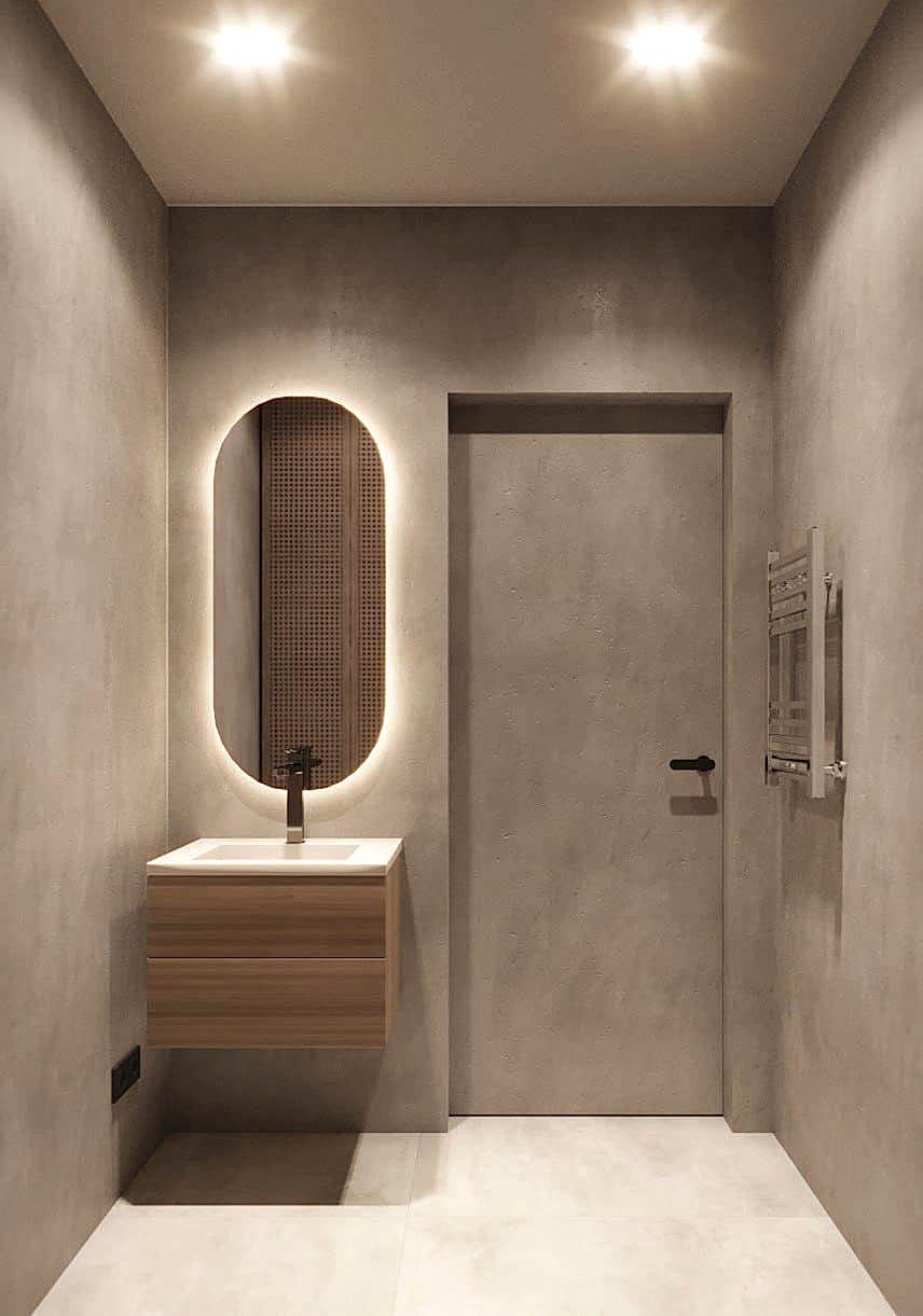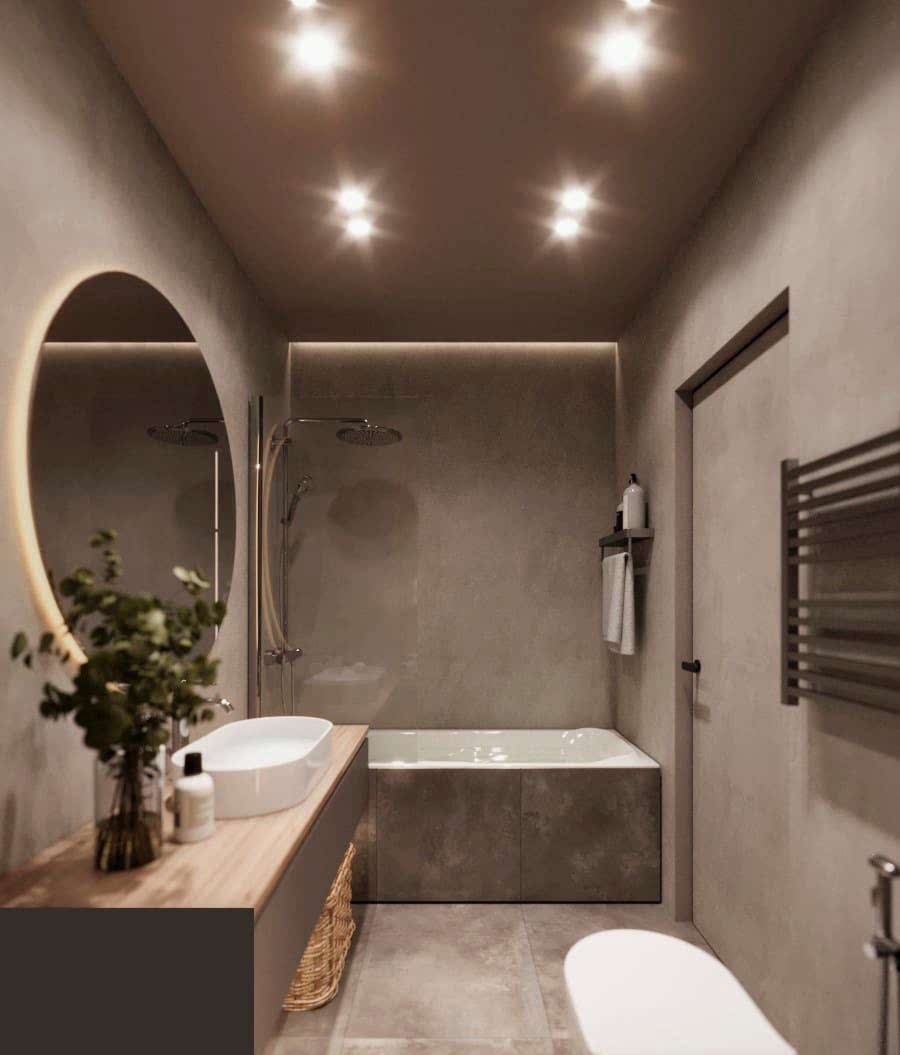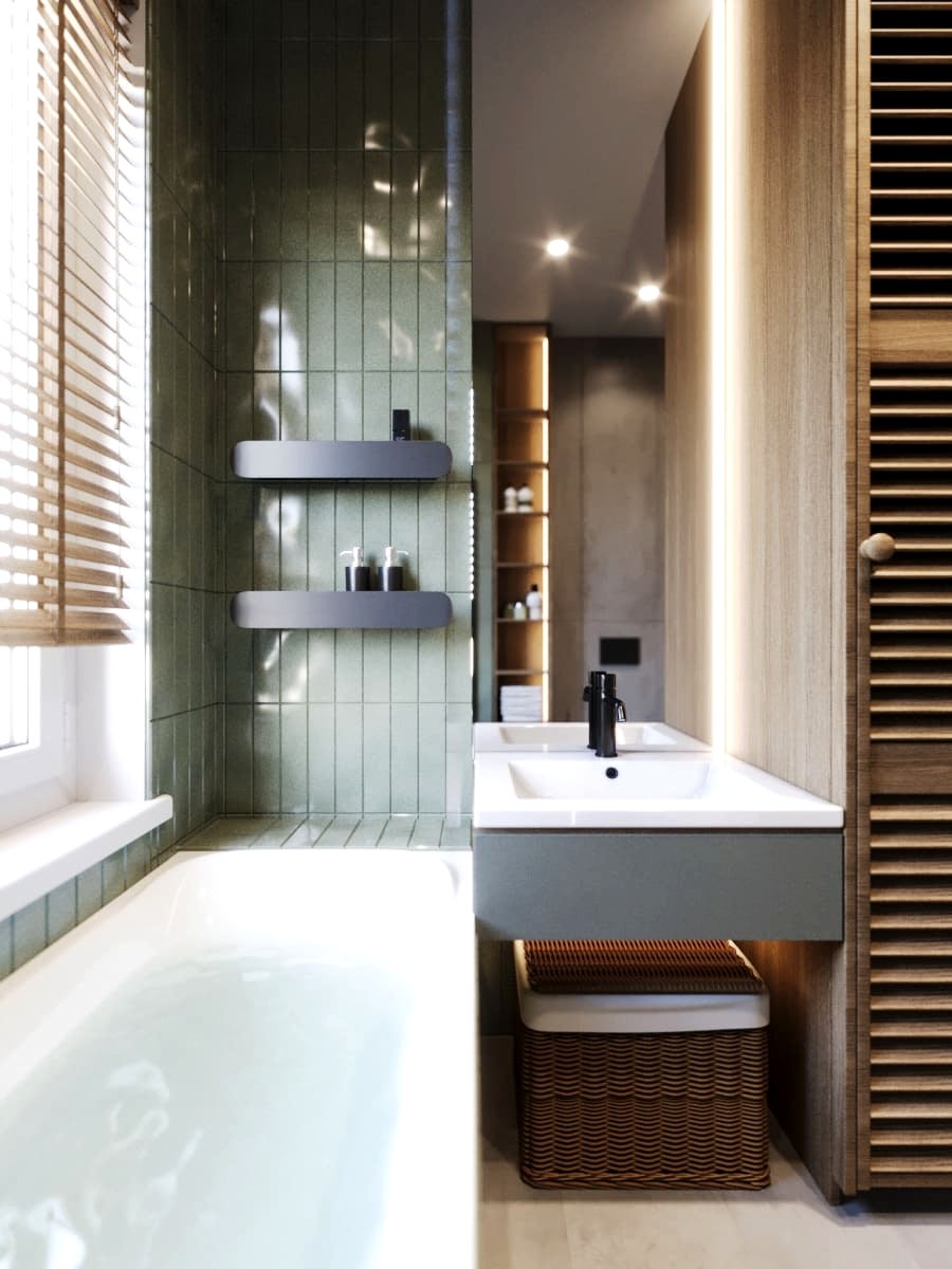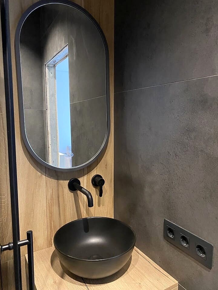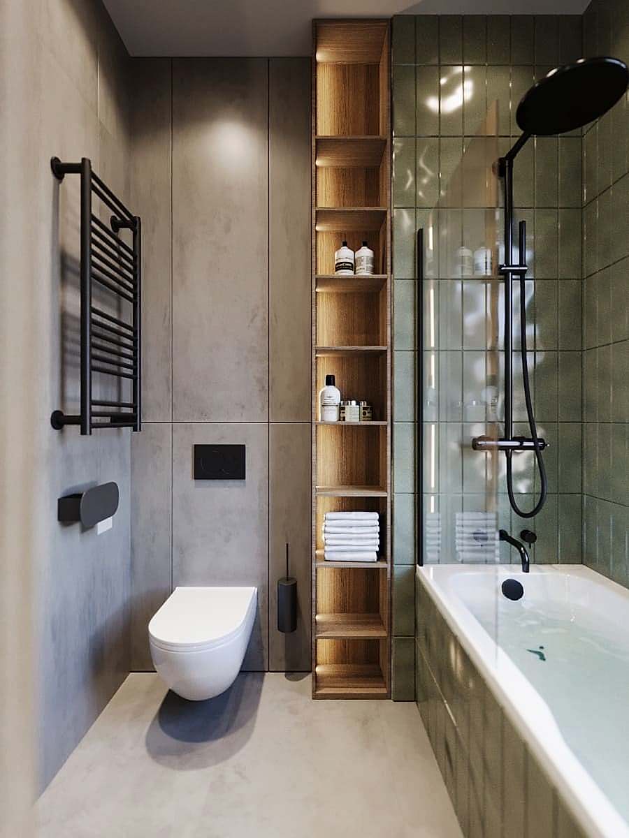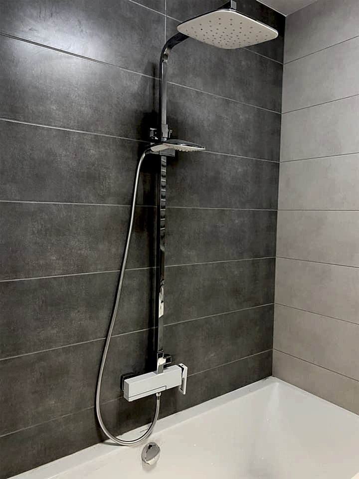 - В санузлах: разводка сантехники, на стенах и PinUp - кафель или керамогранит (размер до 60х60), унитазы подвесные с инсталляцией, акриловая ванна с экраном под кафель, ниши и полки из кафеля