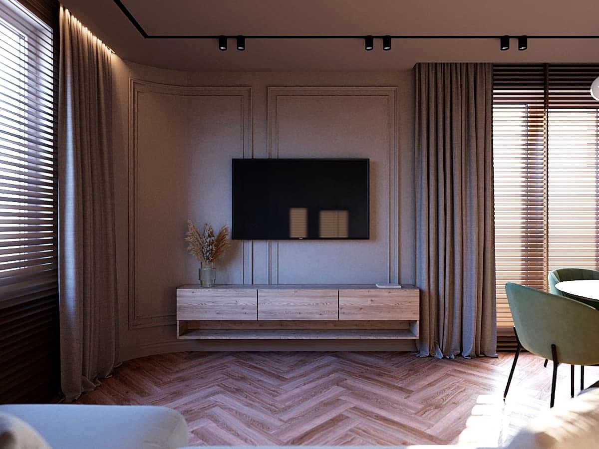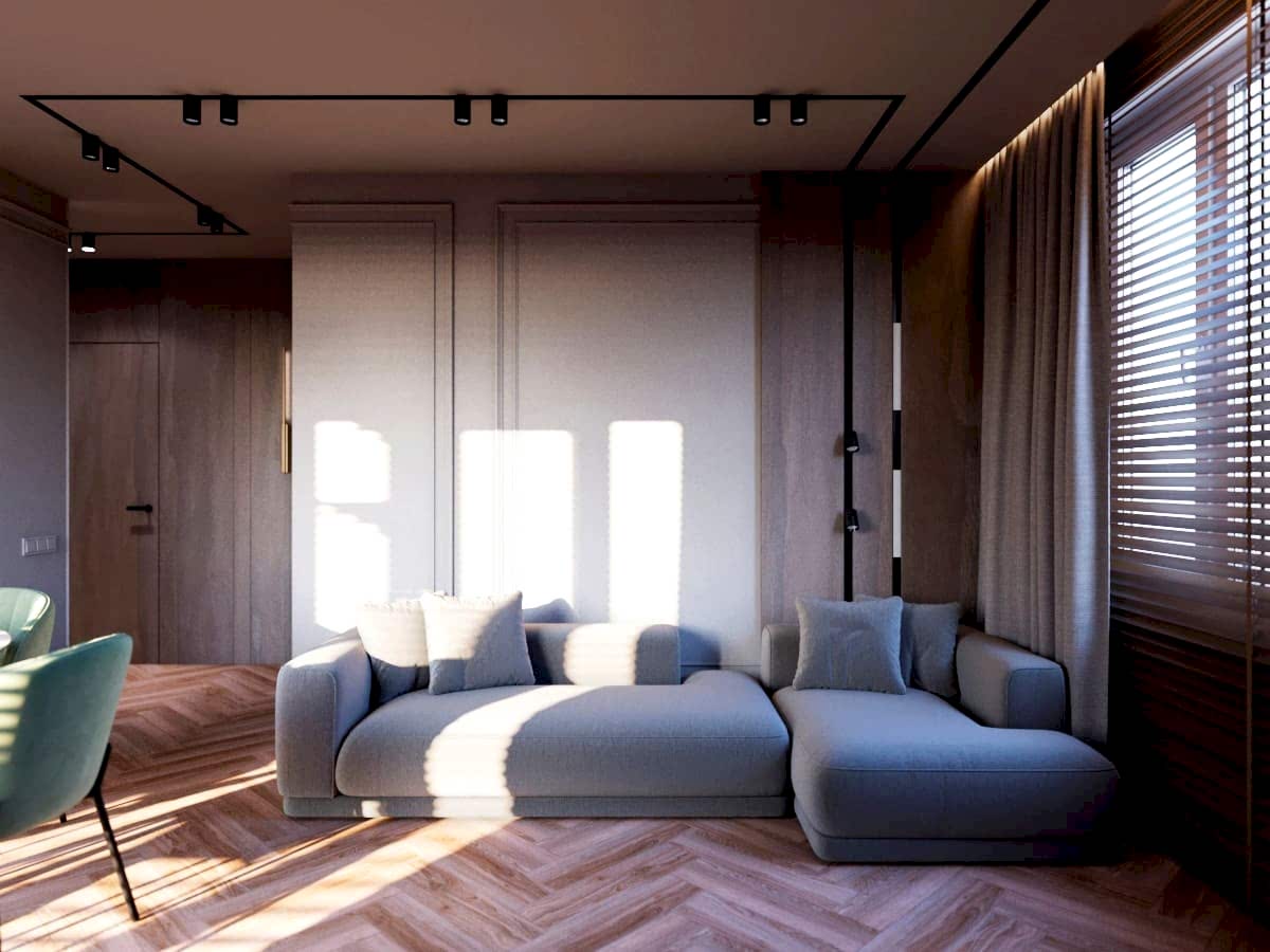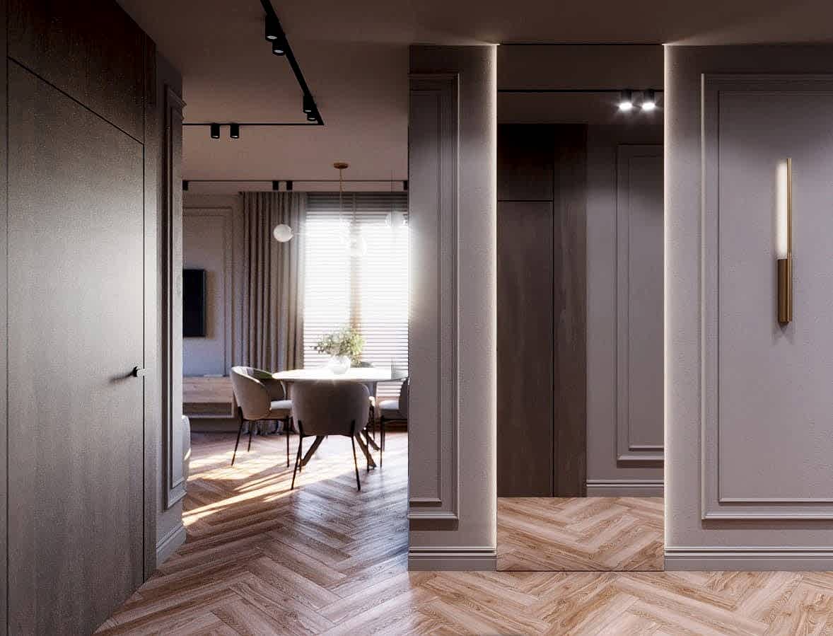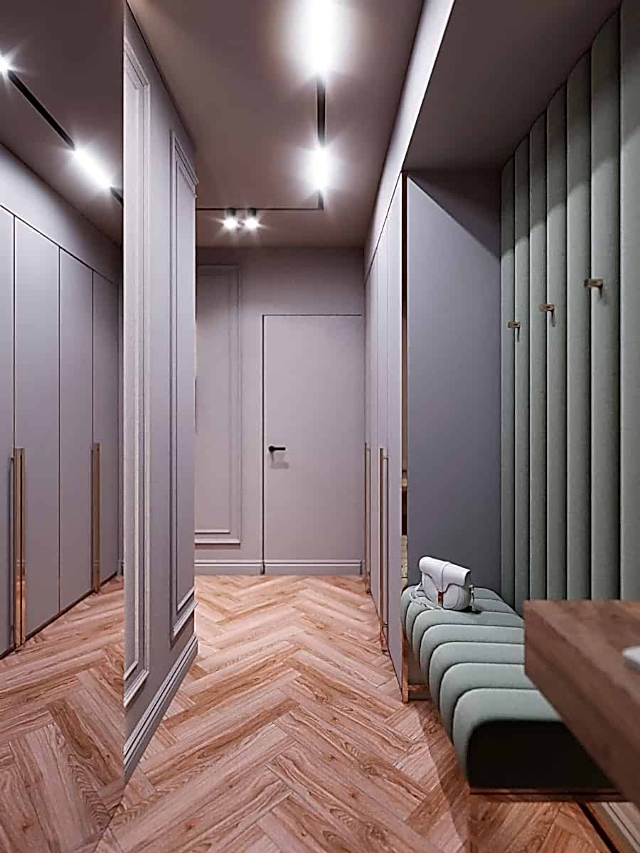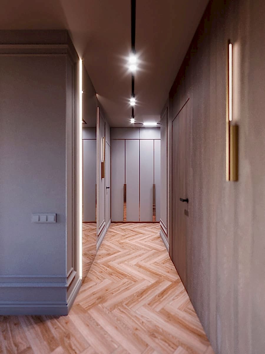 - На полу PinUp ламинат или замковая ПВХ плитка, допускается керамогранит в коридоре и кухонной зоне, плинтус ПВХ или МДФ, теплый пол