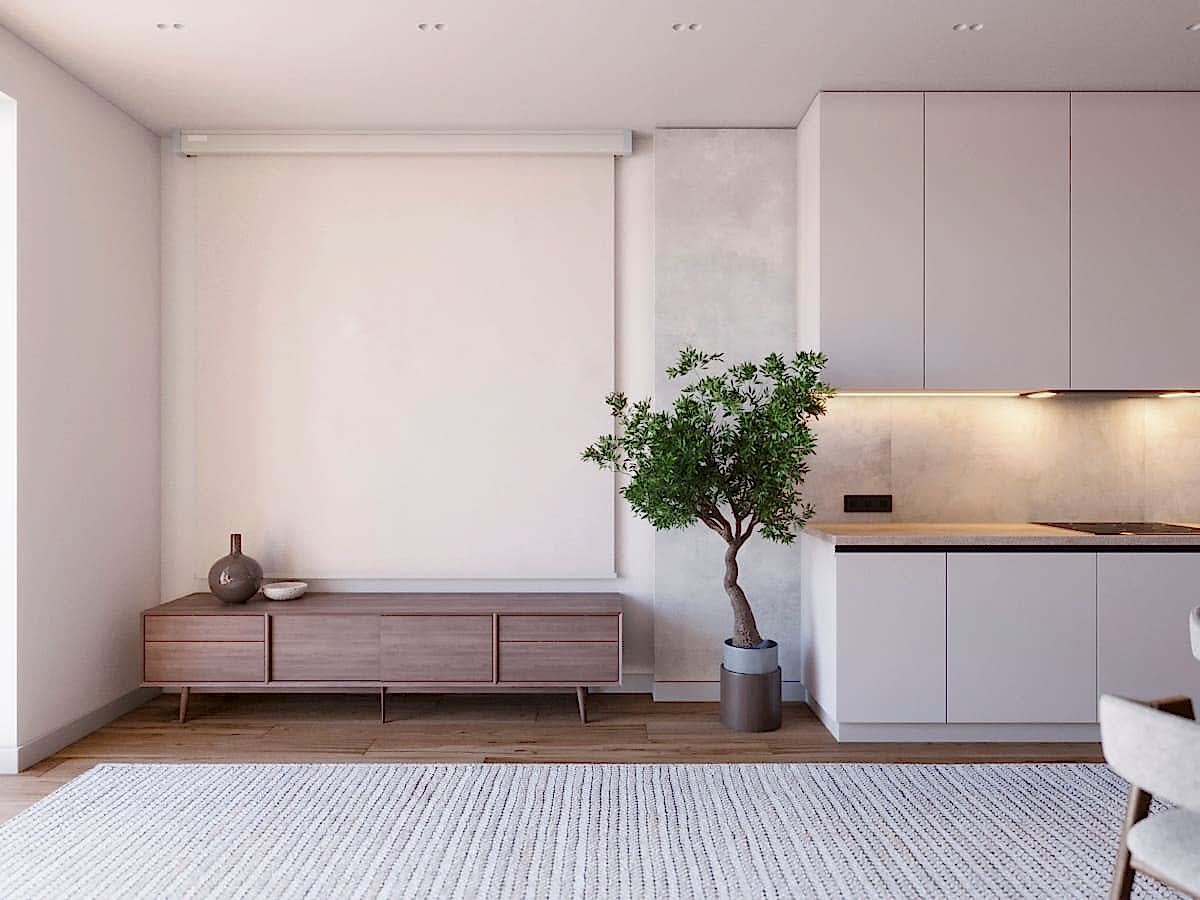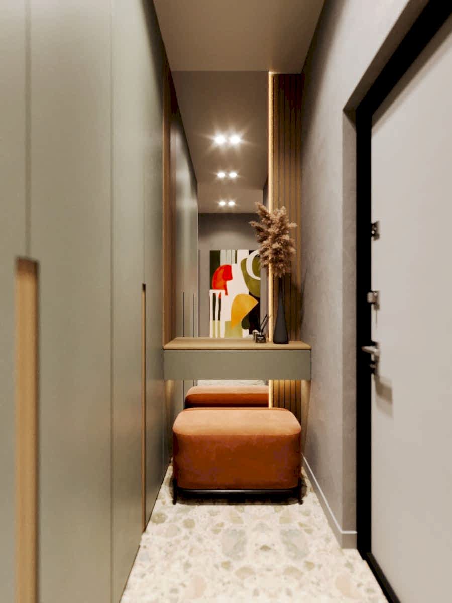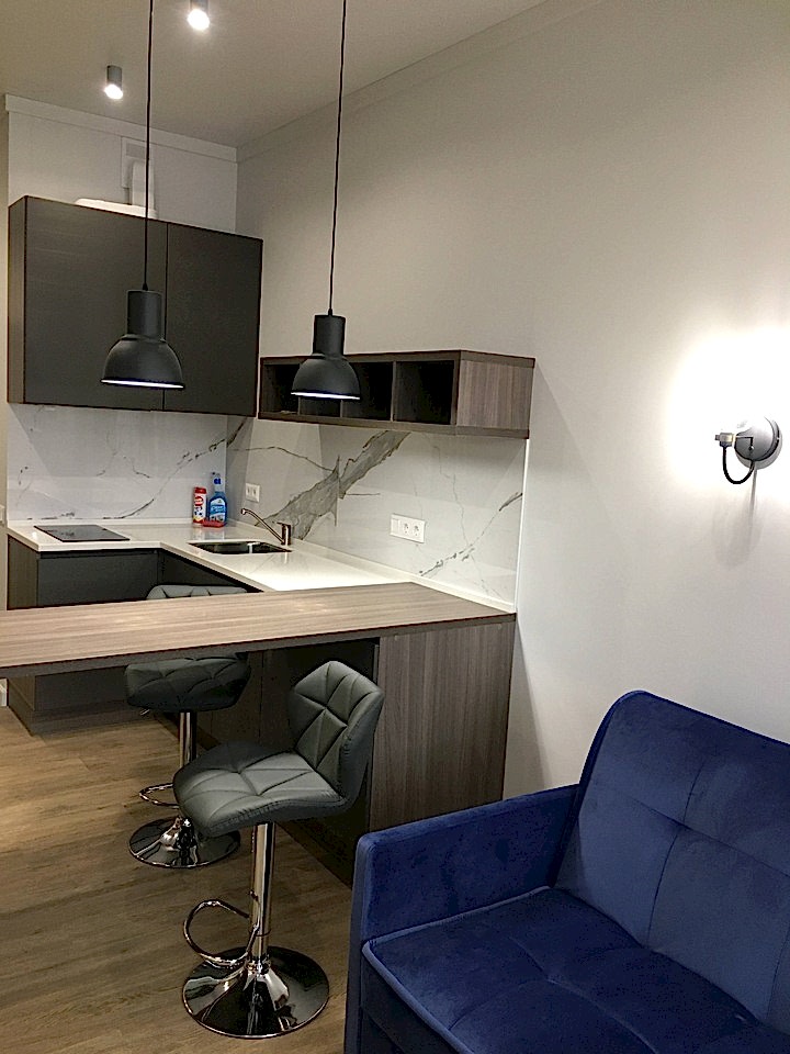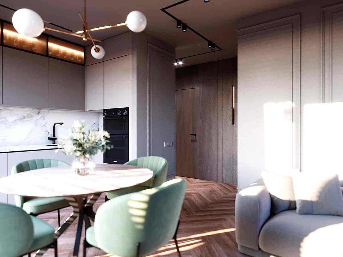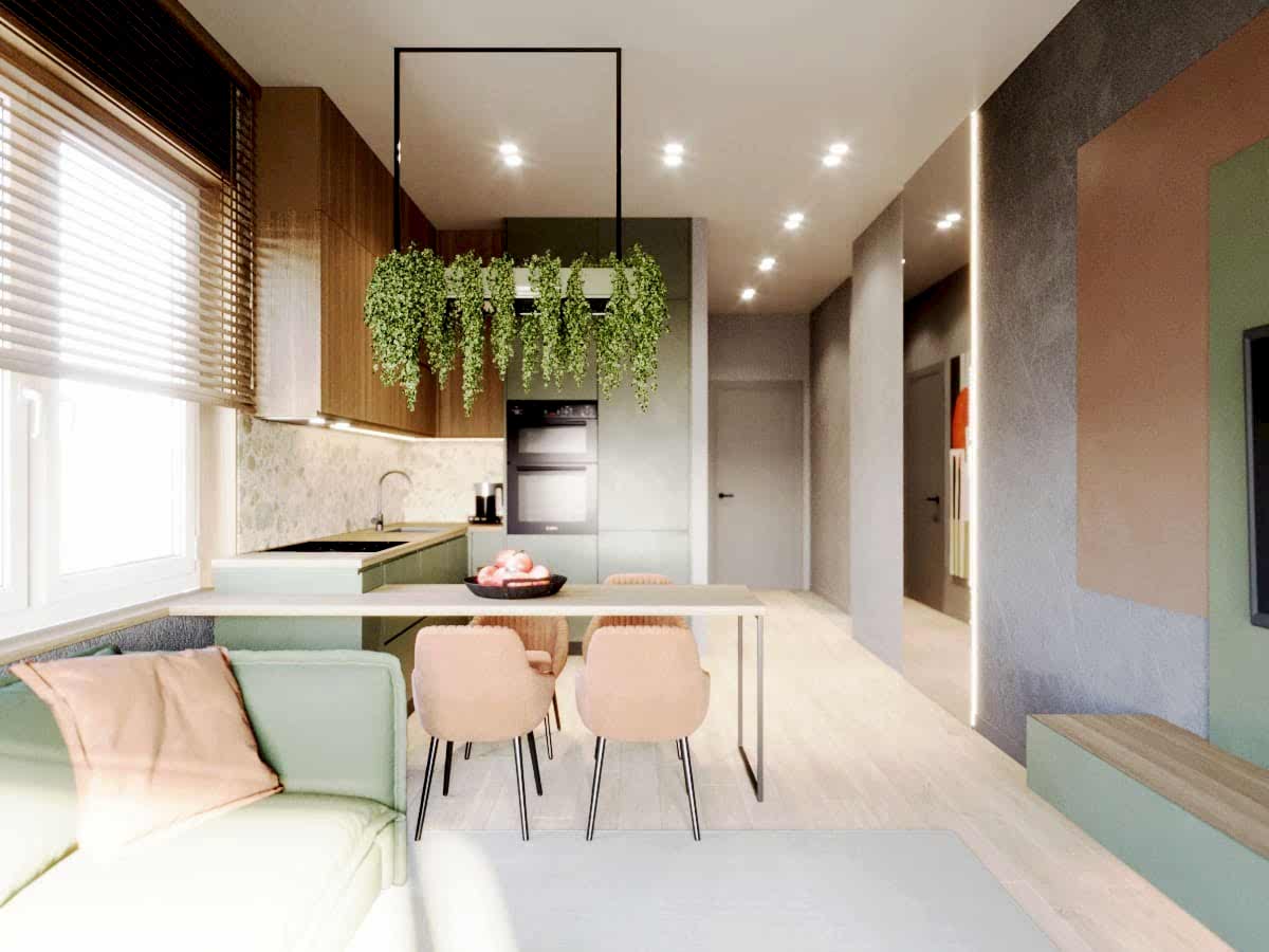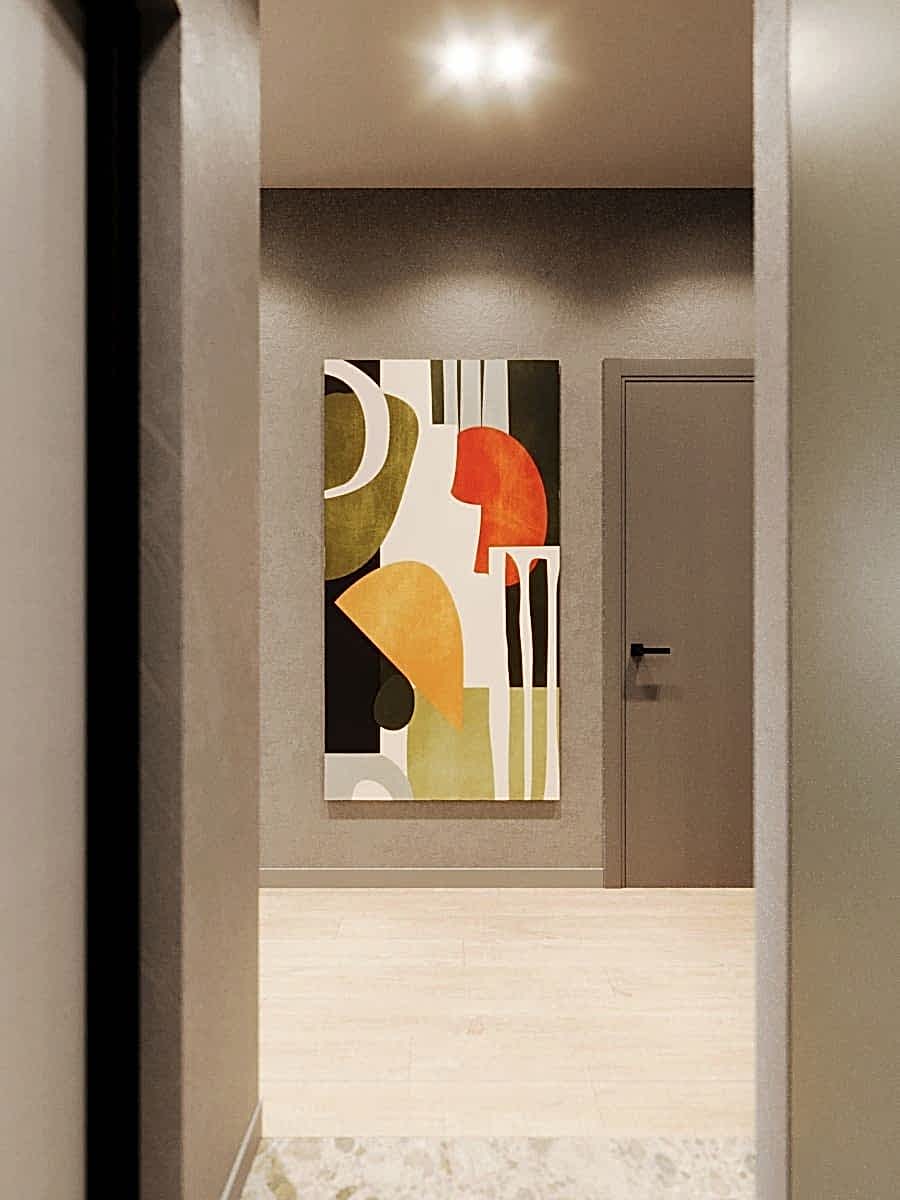 - На полу PinUp ламинат или замковая ПВХ плитка, допускается керамогранит в коридоре и кухонной зоне, плинтус ПВХ или МДФ, теплый пол
