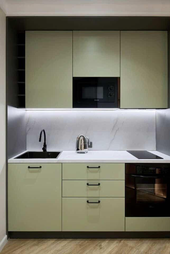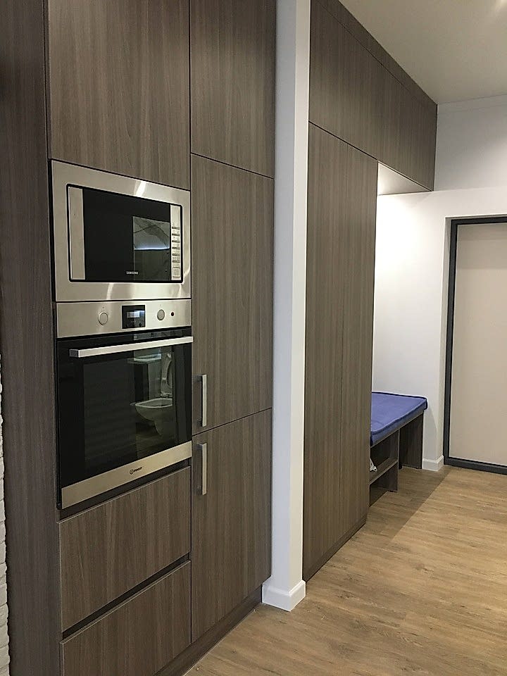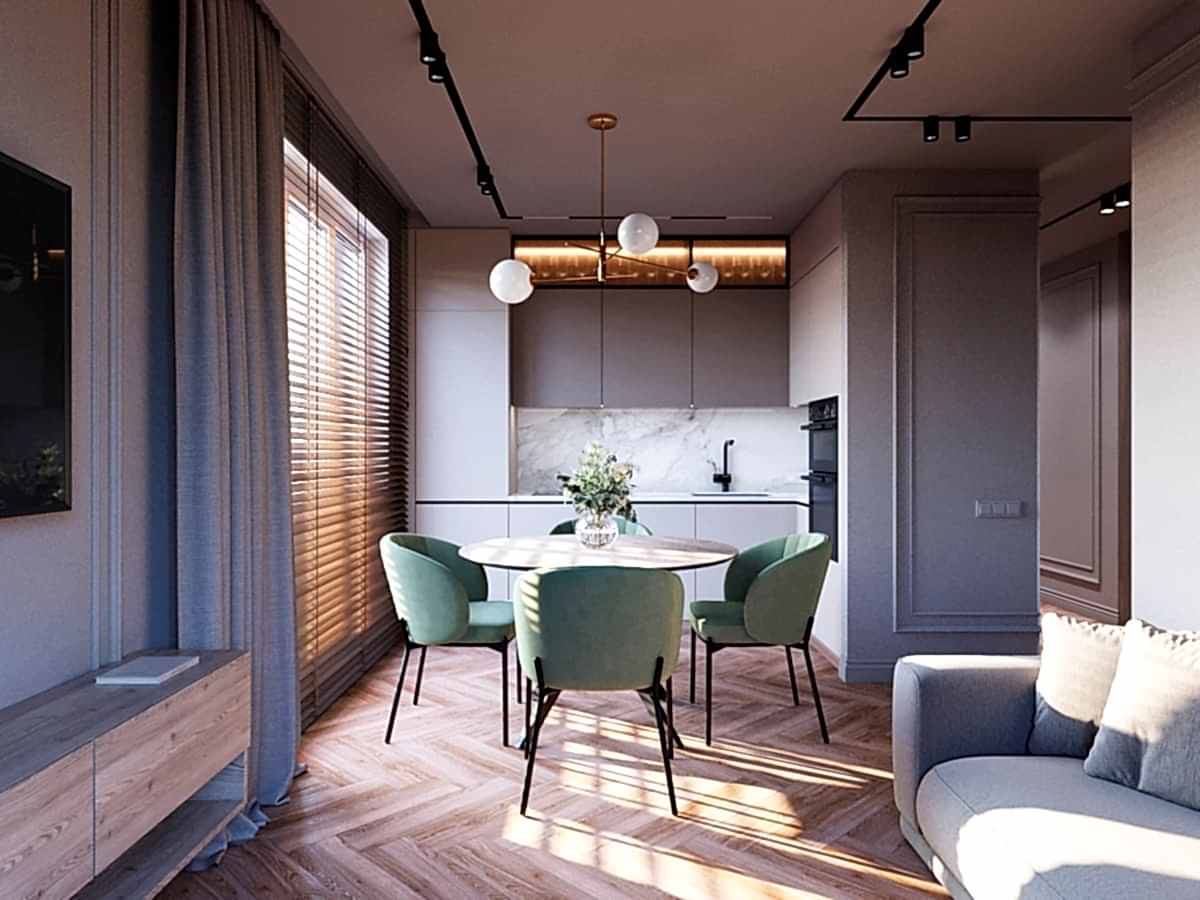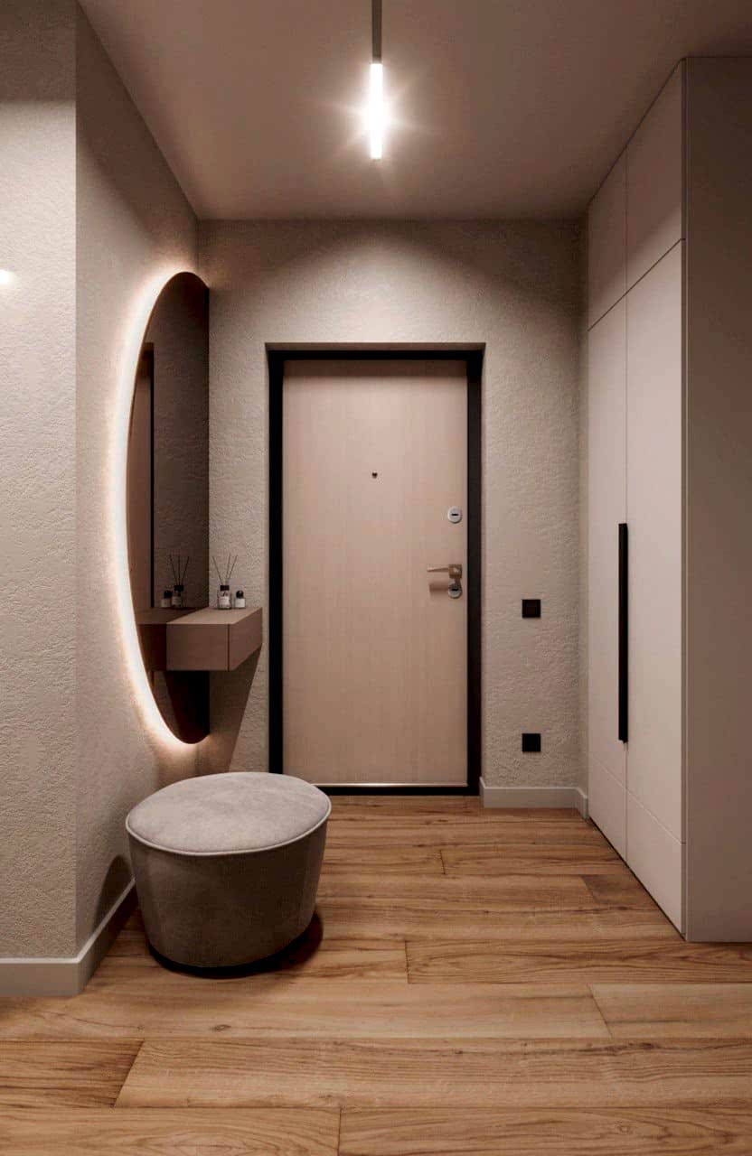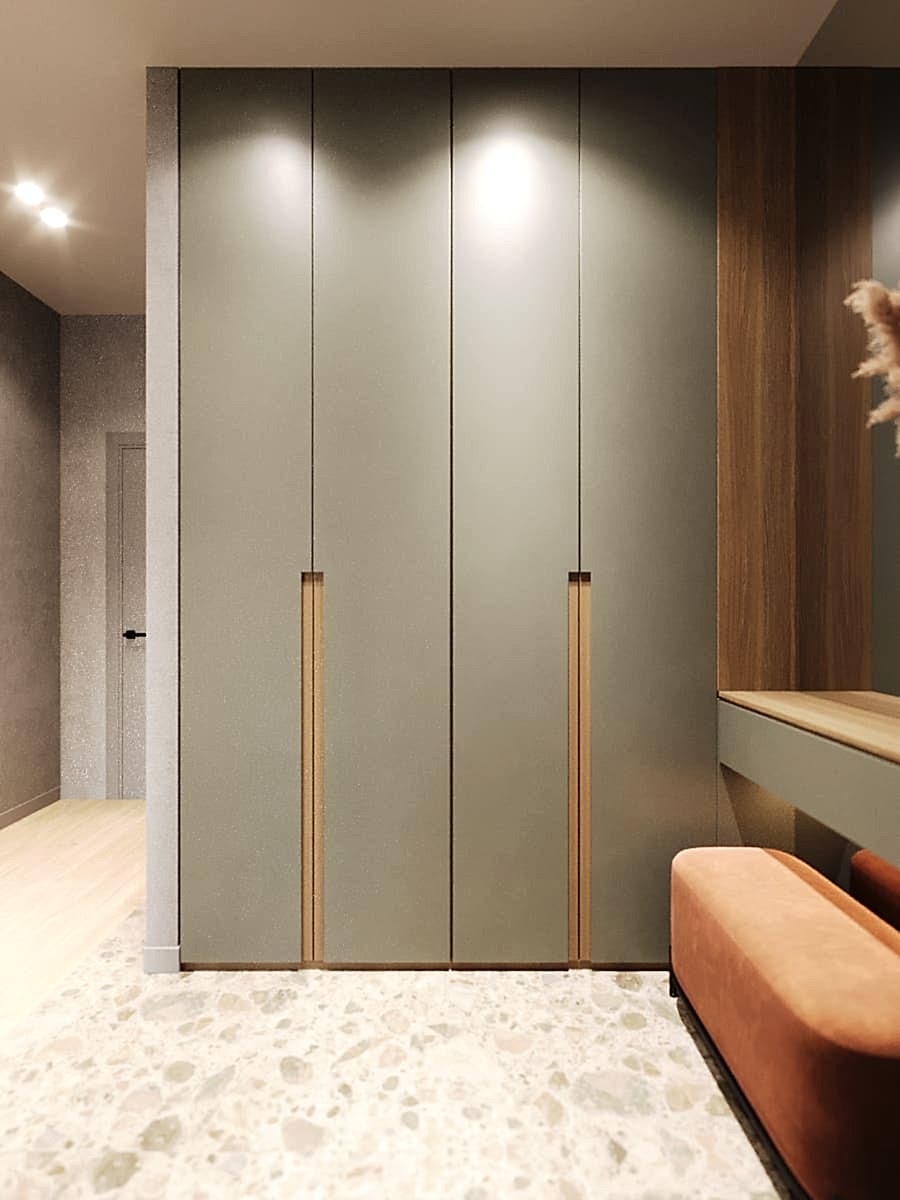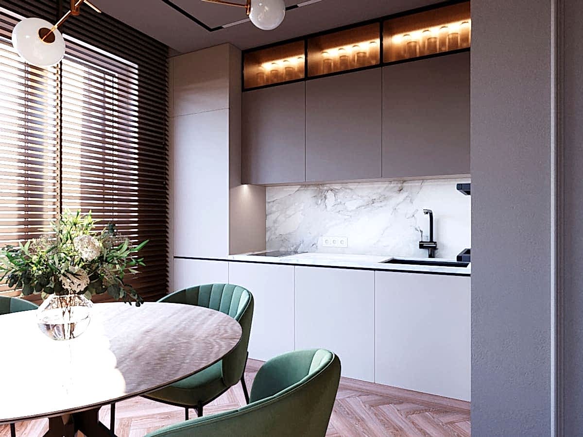 - На полу PinUp ламинат или замковая ПВХ плитка, допускается керамогранит в коридоре и кухонной зоне, плинтус ПВХ или МДФ, теплый пол