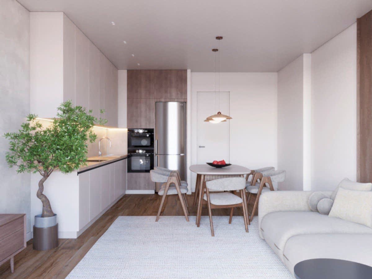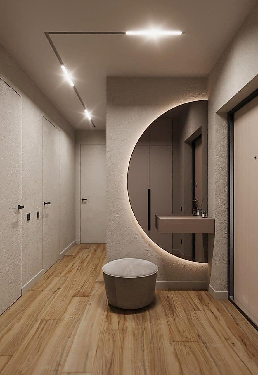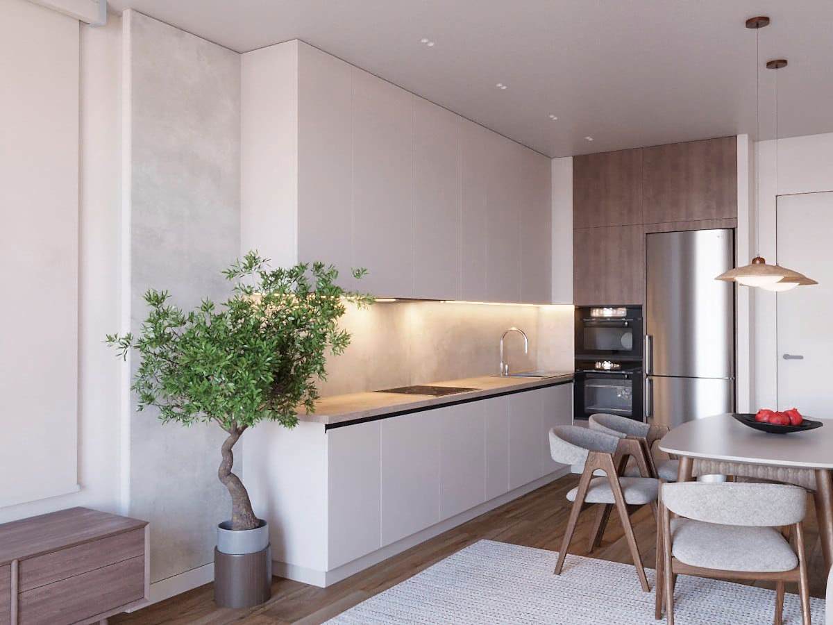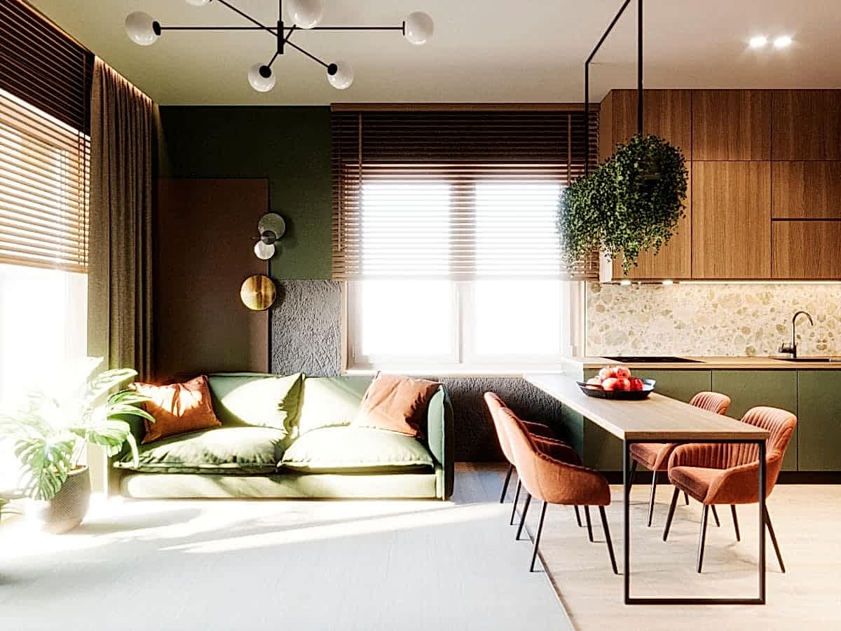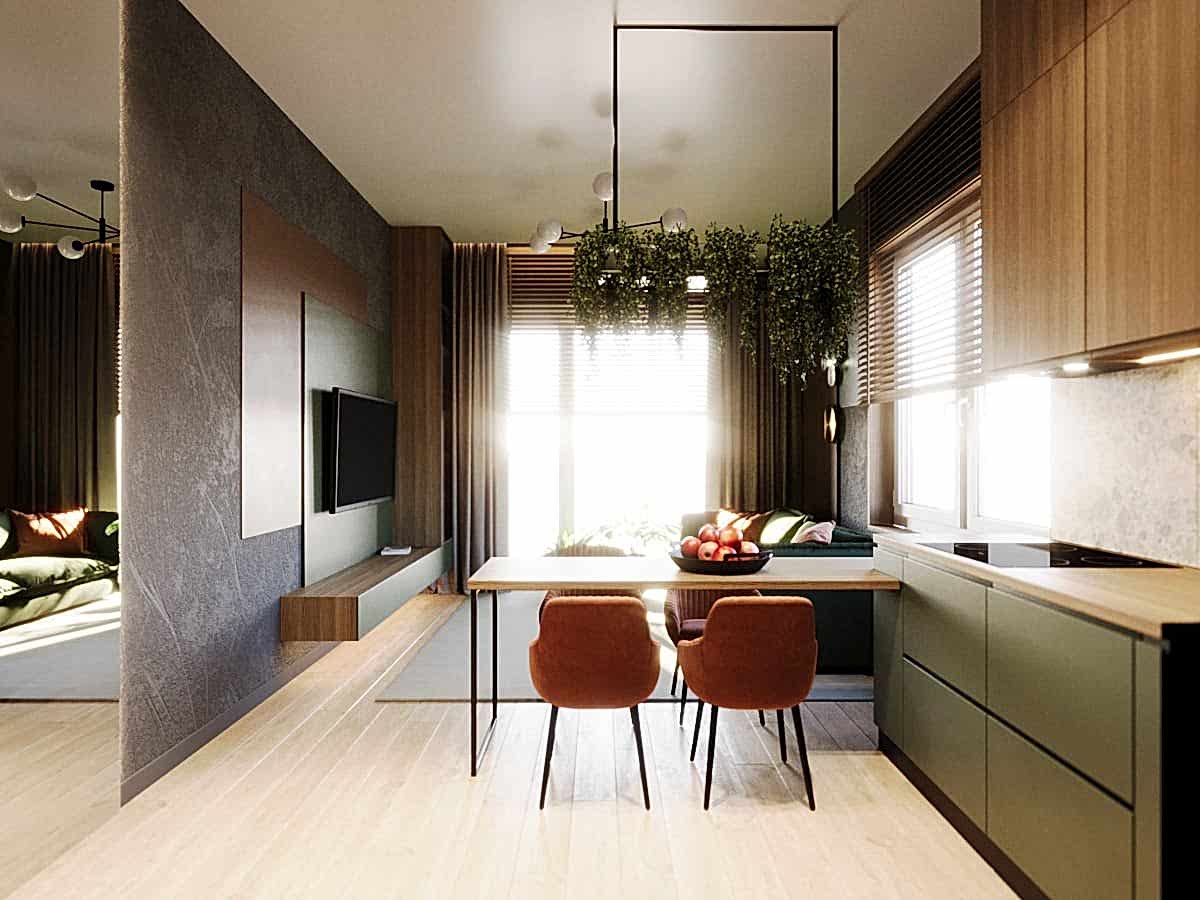 - На полу PinUp ламинат или замковая ПВХ плитка, допускается керамогранит в коридоре и кухонной зоне, плинтус ПВХ или МДФ, теплый пол