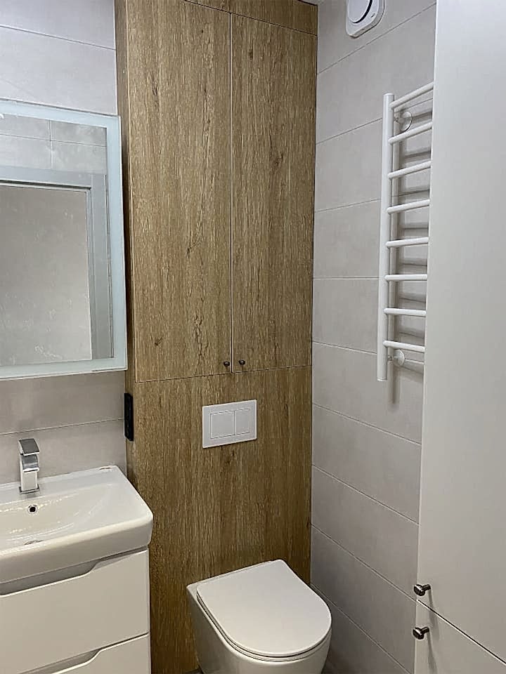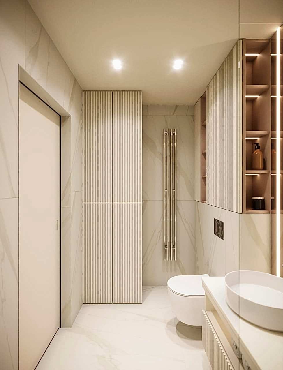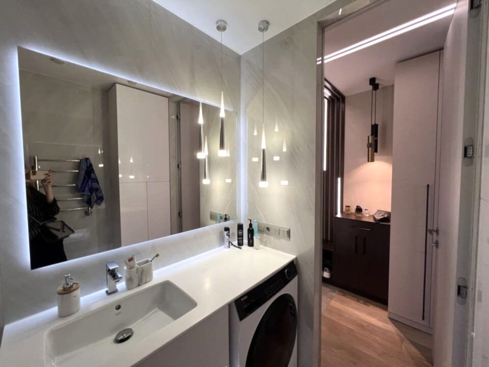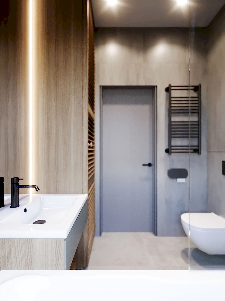 - В санузлах: разводка сантехники, на стенах и полу - кафель или керамогранит (в т.ч. крупноформатный)/покраска, унитазы PinUp с инсталляцией, акриловая ванна с экраном под кафель, встраиваемые смесители, ниши и полки из керамогранита