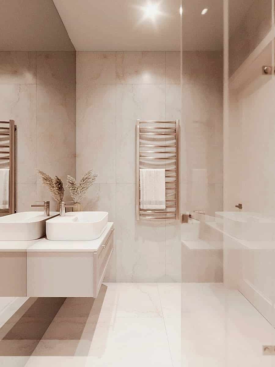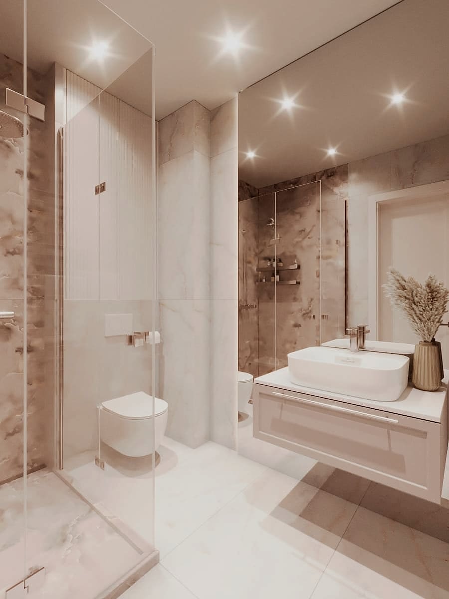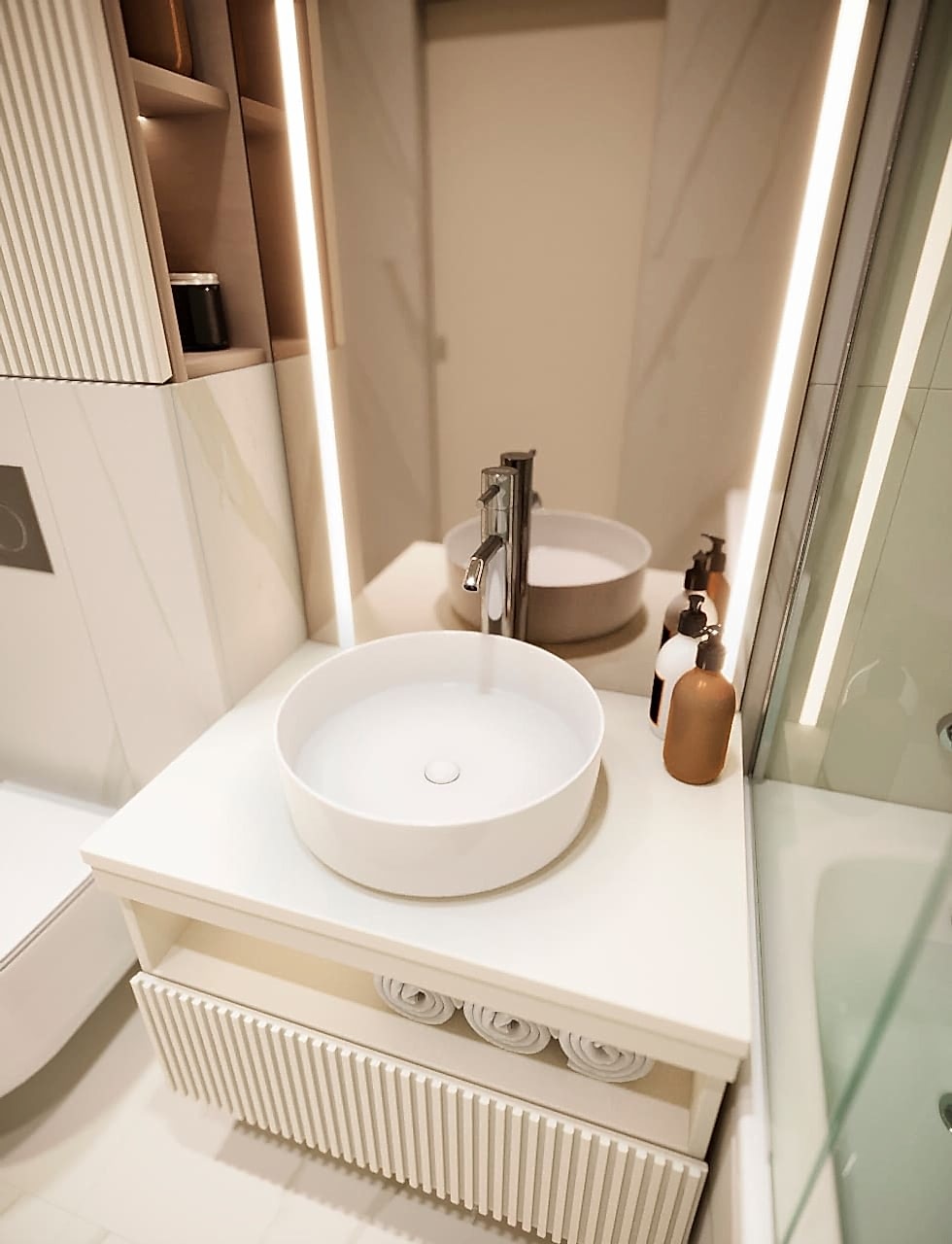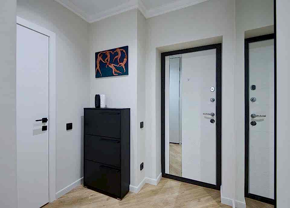 - В санузлах: разводка сантехники, на стенах и полу - кафель или керамогранит (в т.ч. крупноформатный)/покраска, унитазы PinUp с инсталляцией, акриловая ванна с экраном под кафель, встраиваемые смесители, ниши и полки из керамогранита