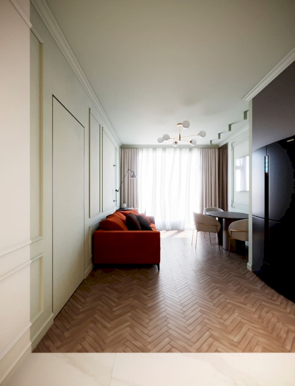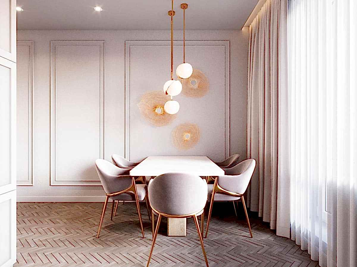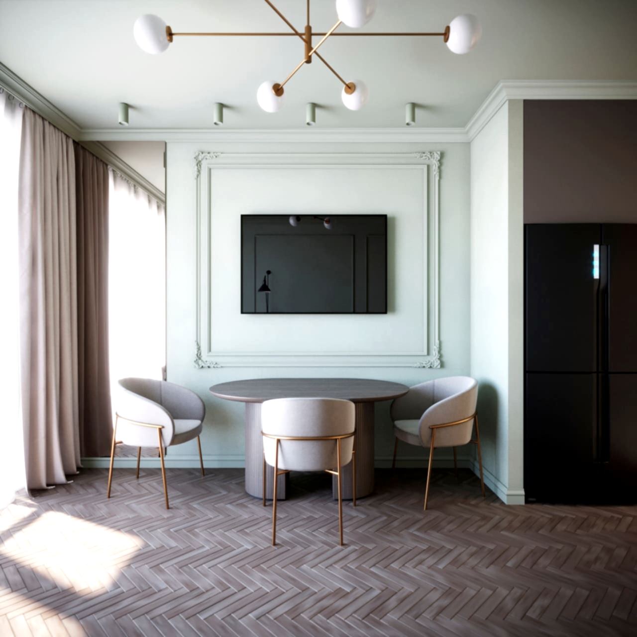 - Стены PinUp на стенах обычные обои или обои под покраску, не менее 30% стен могут быть окрашены классическим способом или с нанесением декоративной штукатурки, молдинги на стенах
